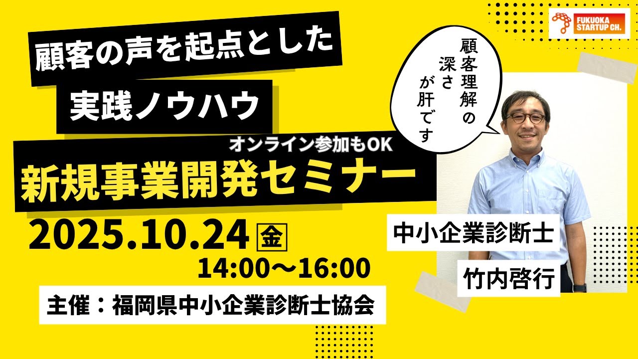 福岡開催の本セミナーは、中小企業診断士・竹内啓行氏が、顧客インサイトの発見から事業アイデアへの変換、検証プロセスまでを体系的に解説。新規事業開発・事業立ち上げを目指す経営者・担当者必見の実践型セミナーをご紹介します。
