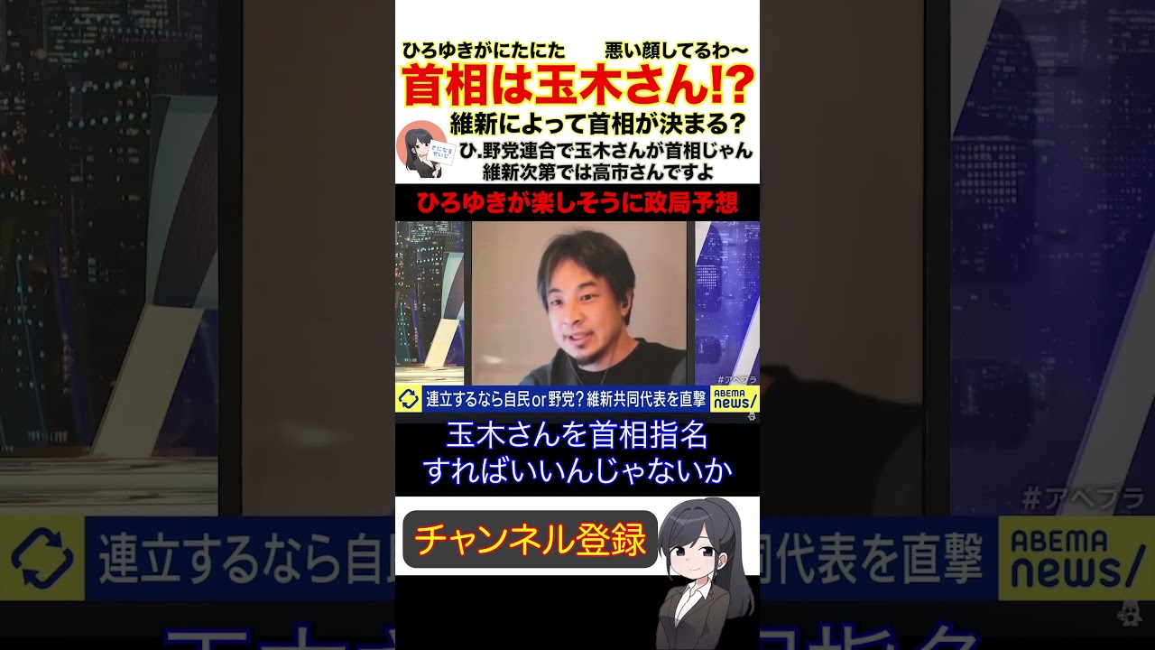#ひろゆき #首班指名 #高市早苗 #玉木雄一郎 #日本維新の会 #藤田共同代表 #アベプラ #政局 #自民党 #国民民主党 #野党連合 #日本政治 #1分要約 #プレイバック政治 #政治ニュース
