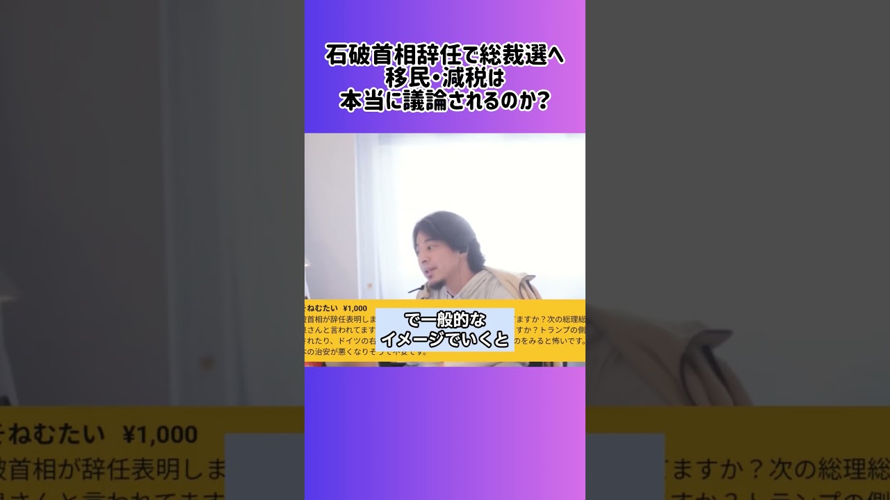 【ひろゆき】石破首相辞任で総裁選へ。移民・減税は本当に議論されるのか? #shorts #ひろゆき #総裁選 #移民問題 #治安不安 #政治の裏側 #右派議員の死 #小泉進次郎 #進次郎構文 2025年10月22日 okutakushi 0 Comments コメントを残す コメントをキャンセルメールアドレスが公開されることはありません。 ※ が付いている欄は必須項目ですコメント ※ 名前 ※ メール ※ サイト 次回のコメントで使用するためブラウザーに自分の名前、メールアドレス、サイトを保存する。 投稿ナビゲーション Previous: 「デジタルなんかの問題じゃない!」ひろゆき、ズレた政治家に怒りの正論!【2023年7月29日】#ひろゆき#自民党#政治家#デジタルNext: 【ひろゆき完全論破】教師の質低すぎる!教師を激詰めするひろゆき