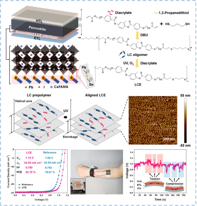 论文题目为“Wearable perovskite solar cells by aligned liquid crystal elastomers”,李琳博士、宋延林研究员、苏萌研究员(中科院化学所)和陈一旺教授(江西师范大学)为共同通讯作者。论文提出了一种通过液晶弹性体取向界面层构建有序电荷传输通道的增韧策略,可顺利实现稳定可穿戴钙钛矿太阳能电池的集成制备。