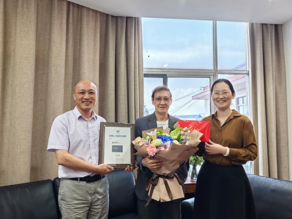 郭静和顾志华关切地询问了院士的工作生活情况,并为院士送上了“苏州人才城市礼遇卡”,介绍了苏州市近年来在人才建设和科技发展方面的重点工作,对院士为苏州市及学校事业发展和科技领域做出的贡献表达敬意。唐叔贤对市人才办、市科协和学校的关心关怀和支持表示感谢,并围绕人才培养、科技创新、师资队伍和科创会议等方面做了交流,表示将持续开展高水平科学研究,培养人才,带领团队争取创造新成果、新技术、新产品,为各项事业发展贡献智慧和力量。