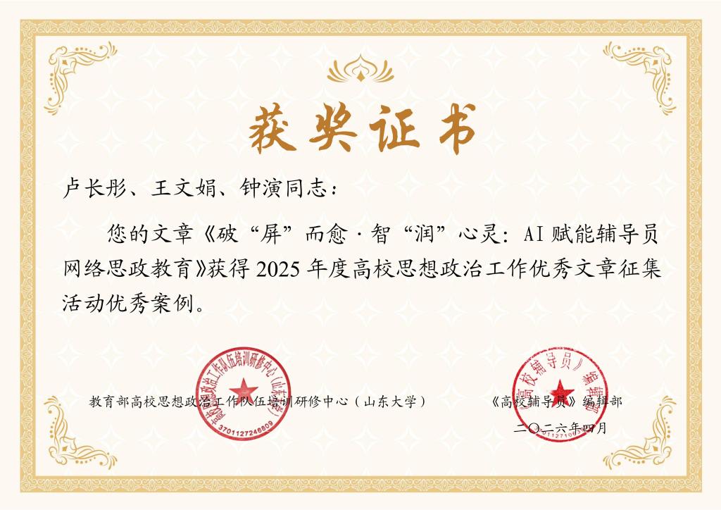 近日,教育部高校思想政治工作队伍培训研修中心(山东大学)、《高校辅导员》编辑部公布了2025年高校思想政治工作优秀文章征集活动评选结果。伟德国际victor·1946源自卢长彤、王文娟、钟演撰写的案例《破“屏”而愈·智“润”心灵:AI赋能辅导员网络思政教育》获评全国高校思想政治工作优秀案例。