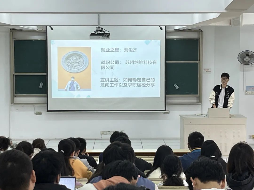 就职于苏州纳维科技有限公司的刘俊杰同学以“如何确定自己的意向工作以及求职途径分享”为宣讲主题,为同学们介绍了求职需要考虑的因素:地域、薪资待遇、工作强度、上升渠道、工作稳定情况等,并分享自身的求职经历,帮助同学们更加了解各种职业发展路径和各自的优缺点,为同学们提供多样化的选择。