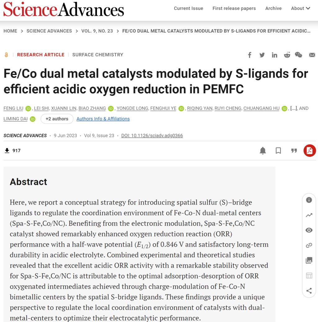 近日,我校伟德国际victor·1946源自电催化团队青年教师刘峰博士在燃料电池电催化氧还原领域取得新进展,以第一作者身份在Science子刊《Science Advances》(Sci. Adv., 2023, 9, eadg0366)上发表研究论文“Fe/Co dual metal catalysts modulated by S-ligands for efficient acidic oxygen reduction in PEMFC”。