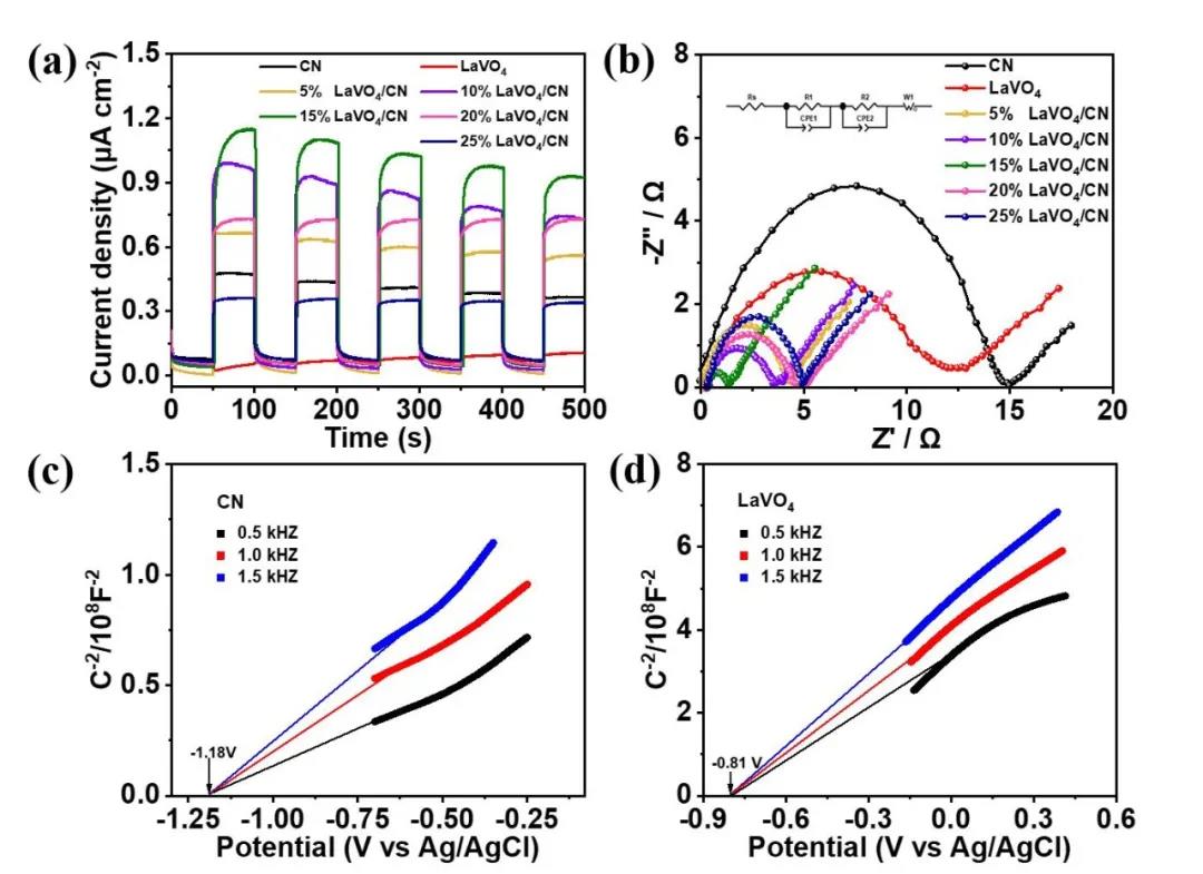 图4.(a)瞬态光电流对比图,(b)电化学阻抗对比图。(c-d)莫特肖特基曲线图谱。
