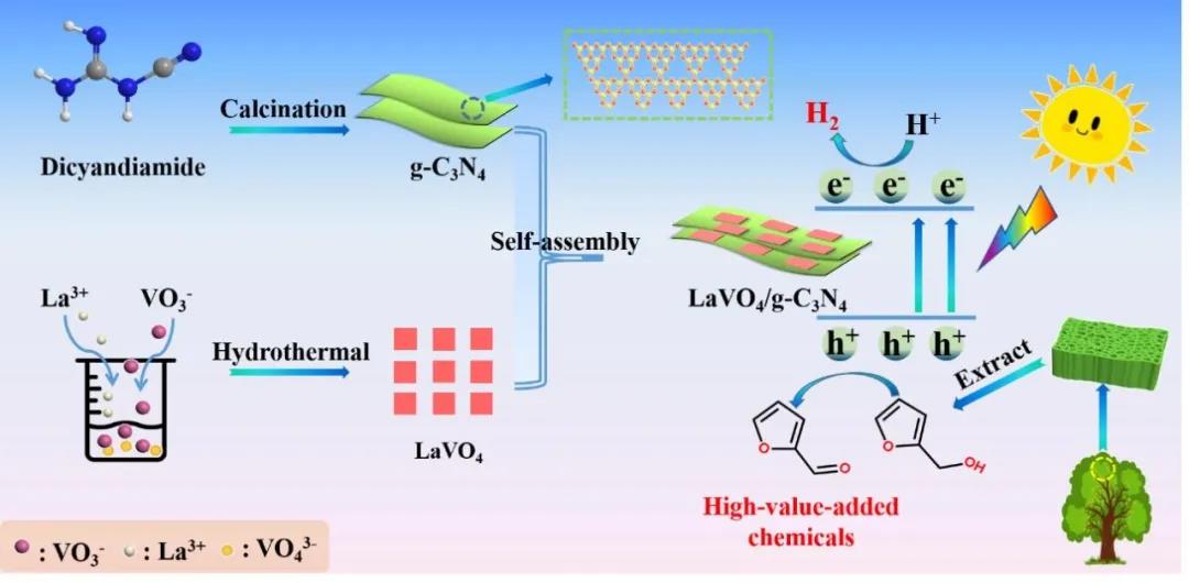 图1. LaVO4/CN异质结的构筑及其光催化产氢协同糠醛生产示意图。