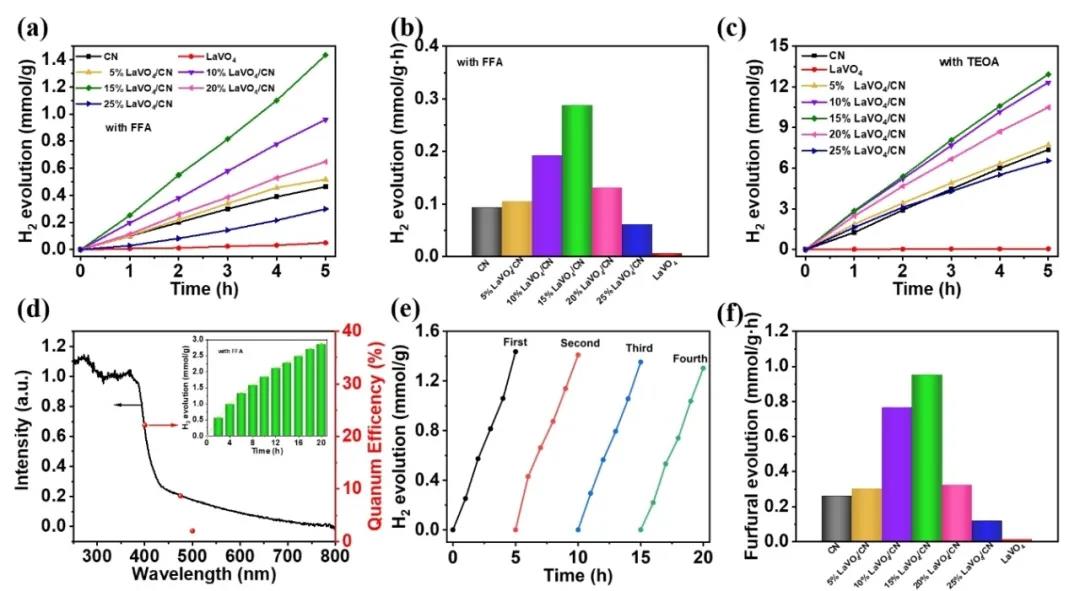 图5. 不同比例光催化剂的析氢性能:(a-b)使用 FFA 作为牺牲剂,(c)使用 TEOA 作为牺牲剂,(d)量子效率(插图为 20 小时内 15% LaVO4/CN析氢性能图),(e)多次循环实验,(f)不同催化剂的糠醛生产速率。
