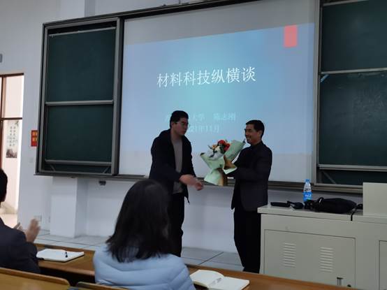 陈志刚教授以“科技创新纵横谈”为题开始了讲座,从千年的文明变迁、四海科技竞争到人生的责任三个角度引导青年师生回顾人类的创新发展,反思了中国科技发展受到封建社会束缚的困境,到今天全国人民全面拥抱科技创新,各种学科、特别是新材料蓬勃发展,甚至处于局部领先的阶段。从罗马到希腊,从东汉到唐朝,从算术到二进制,从火药到航天,创新和文明演变交错,犹如历史画卷上卷绕前行的双子星。陈教授博览群书又紧贴时代,时时不忘引导学生反思社会价值取向,勇于站在新时代的潮流,继承中华民族的优秀文化,实现人生价值,不负韶华。