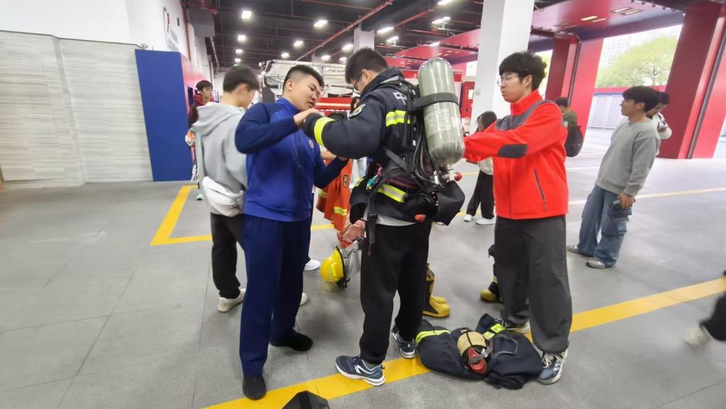 活动中,消防员带领同学们参观了消防车辆、高压水枪、破拆工具等专业救援装备,通过实物讲解与互动体验,让大家直观了解器材功能和使用。同学们还参观了消防员营区和荣誉室,在消防战斗服穿戴环节,大家深刻体会到了消防员工作的艰辛,并对消防员们产生了由衷的敬意。在消防安全座谈会上,消防员结合高校实际,通过真实案例重点讲解实验室、宿舍的防火要点及应急逃生技巧,现场互动积极,学生们纷纷表示收获颇丰。