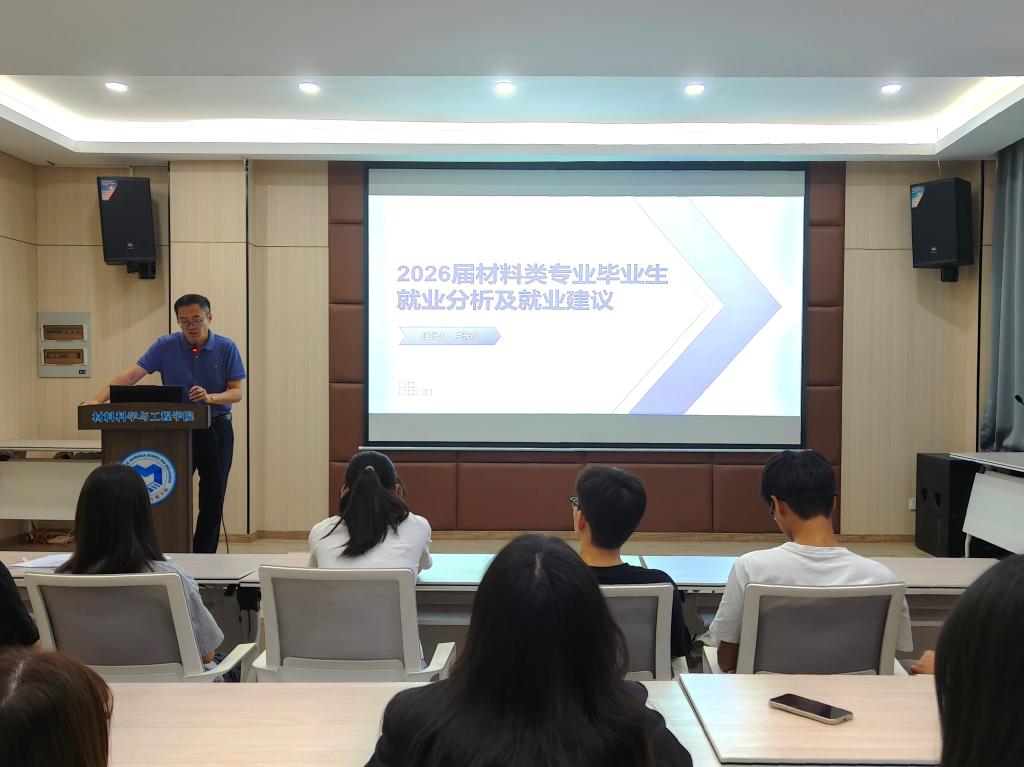 学院党委副书记卢长彤结合国家新材料产业发展规划,深入分析了行业趋势与就业前景,引导学生将个人发展融入产业需求,并通过科研实践、企业实训等途径提升就业竞争力。