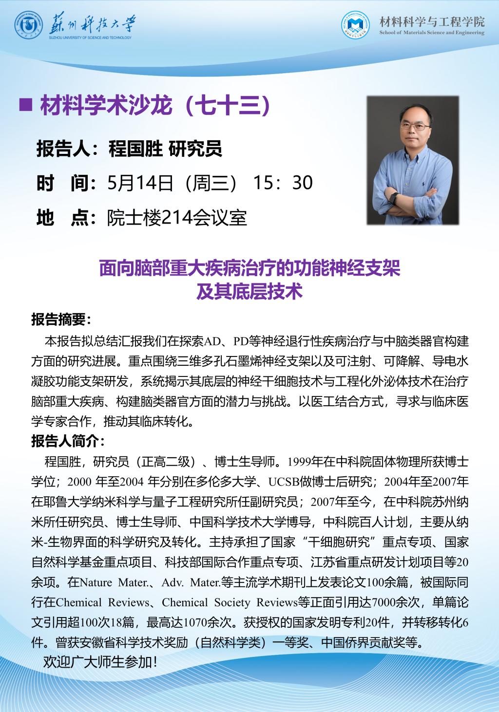 材料学术沙龙七十三:面向脑部重大疾病治疗的功能神经支架及其底层技术