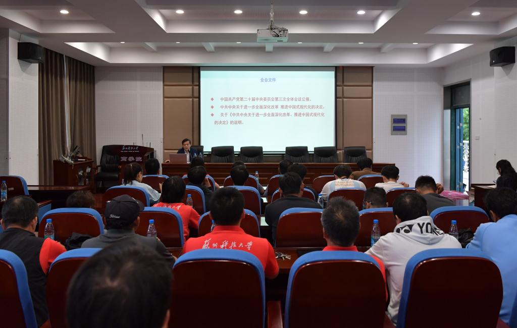 他指出,党的二十届三中全会,是在以中国式现代化全面推进强国建设、民族复兴伟业的关键时期召开的一次十分重要的会议,是新的历史起点上进一步全面深化改革、推进中国式现代化的总动员、总部署。全会通过的《决定》既是党的十八届三中全会以来全面深化改革的实践续篇,也是新征程推进中国式现代化的时代新篇,是党的历史上又一重要纲领性文献。他强调,要全面学习宣传贯彻党的二十届三中全会精神,坚决把思想和行动统一到习近平总书记和党中央关于进一步全面深化改革的决策部署上来,自觉把改革摆在更加突出位置,紧紧围绕推进中国式现代化,解放思想、求真务实、真抓实干,奋力开创进一步全面深化改革新局面,为推进中国式现代化新实践贡献苏科大的智慧和力量!